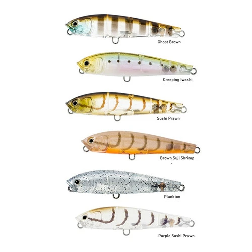 At only 50mm long, the Gekkabijin Shiranui is the perfect choice for smooth water bream, flats whiting, smelting trout or ultra spooky bass. Representing an irresistible, darting baitfish or prawn, it can be fished with a walking the dog action or ripped across the surface, and features a small cupped face that “spits” water on the retrieve.