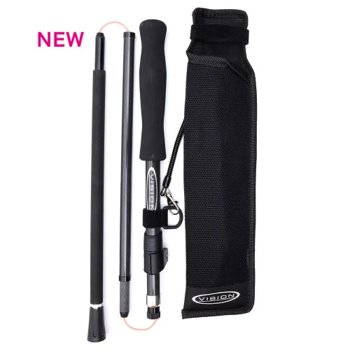 Vision Carbon Fibre Wading Staff. Ultra lightweight and durable. 4 Piece staff with a secure locking clip which also allows you to adjust the height from about 120cm to 143cm to fit all fishermen of all heights. The bottom part is made from aluminium, so it gives it some weight to stay on the bottom. It has a tungsten tip for good grip and a soft shrink tubing to eliminate noise while wading. All joints have aluminium end rings for added strength.