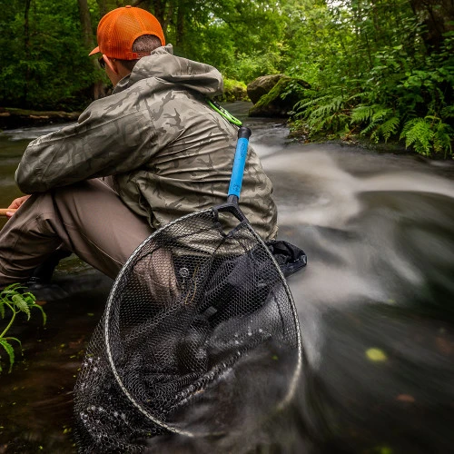 Superior quality net with a lightweight aluminum frame, short 24cm handle and 50cm deep rubber net. Perfect size for big trout on the coast or on the rivers. The net has a comfortable blue EVA handle.